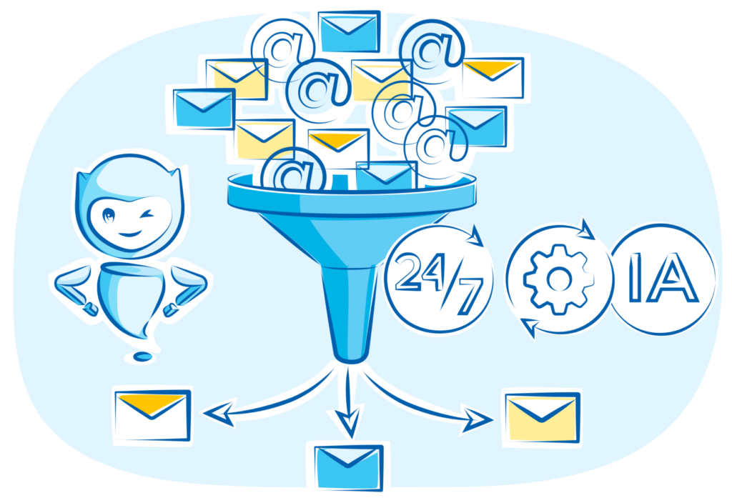 Le robot de traitement des emails comprend et catégorise la demande écrite. Il peut ensuite classer l’email ou le transférer à un conseiller qui saura traiter spécifiquement la problématique exprimée.